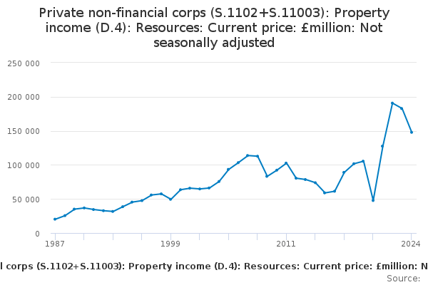 Download this time seriesPrivate non-financial corps (S.1102+S.11003): Property income (D.4): Resources: Current price: £million: Not seasonally adjusted