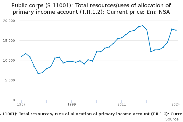 Download this time seriesPublic corps (S.11001): Total resources/uses of allocation of primary income account (T.II.1.2): Current price: £m: NSA