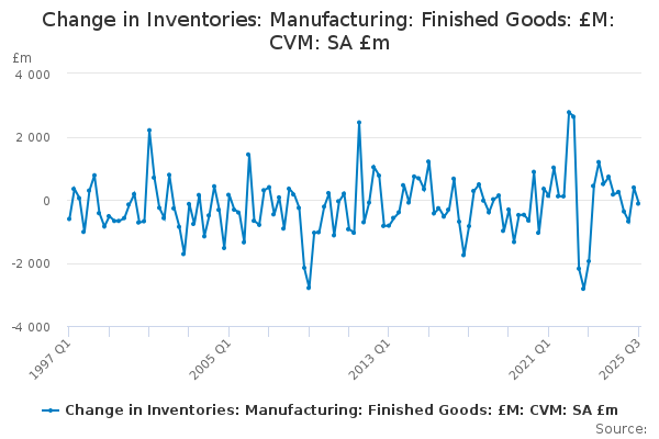 Download this time seriesChange in Inventories: Manufacturing: Finished Goods: £M: CVM: SA £m