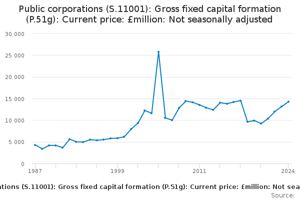 Download this time seriesPublic corporations (S.11001): Gross fixed capital formation (P.51g): Current price: £million: Not seasonally adjusted
