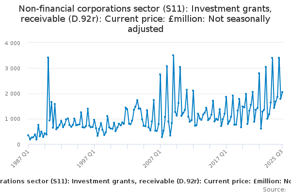 Download this time seriesNon-financial corporations sector (S11): Investment grants, receivable (D.92r): Current price: £million: Not seasonally adjusted