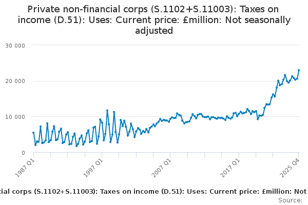 Download this time seriesPrivate non-financial corps (S.1102+S.11003): Taxes on income (D.51): Uses: Current price: £million: Not seasonally adjusted