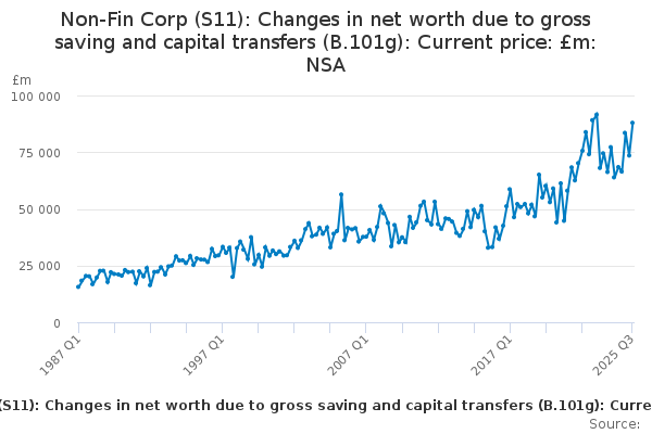 Download this time seriesNon-Fin Corp (S11): Changes in net worth due to gross saving and capital transfers (B.101g): Current price: £m: NSA
