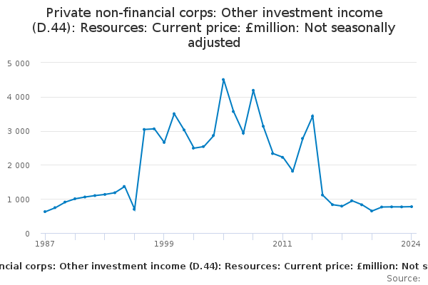 Download this time seriesPrivate non-financial corps: Other investment income (D.44): Resources: Current price: £million: Not seasonally adjusted