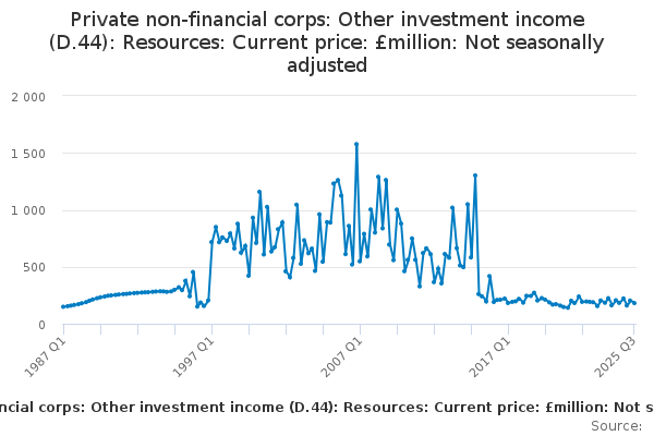 Download this time seriesPrivate non-financial corps: Other investment income (D.44): Resources: Current price: £million: Not seasonally adjusted