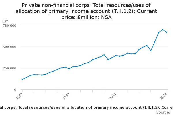 Download this time seriesPrivate non-financial corps: Total resources/uses of allocation of primary income account (T.II.1.2): Current price: £million: NSA