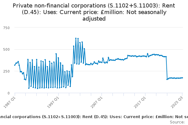 Download this time seriesPrivate non-financial corporations (S.1102+S.11003): Rent (D.45): Uses: Current price: £million: Not seasonally adjusted