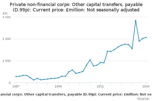 Download this time seriesPrivate non-financial corps: Other capital transfers, payable (D.99p): Current price: £million: Not seasonally adjusted