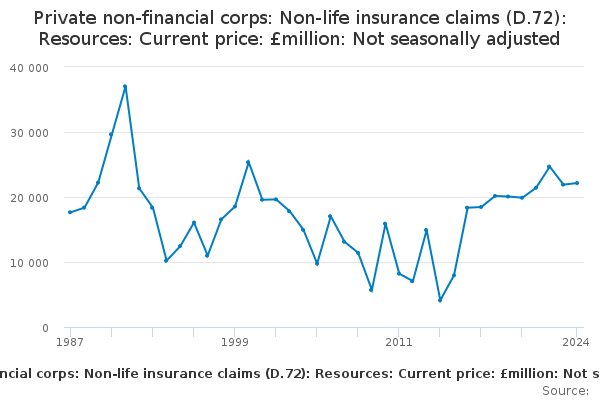 Download this time seriesPrivate non-financial corps: Non-life insurance claims (D.72): Resources: Current price: £million: Not seasonally adjusted