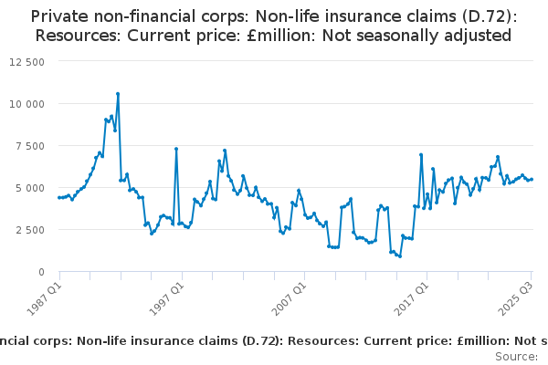 Download this time seriesPrivate non-financial corps: Non-life insurance claims (D.72): Resources: Current price: £million: Not seasonally adjusted