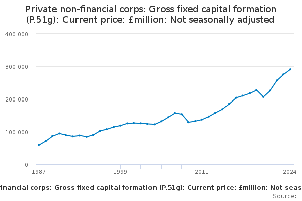 Download this time seriesPrivate non-financial corps: Gross fixed capital formation (P.51g): Current price: £million: Not seasonally adjusted