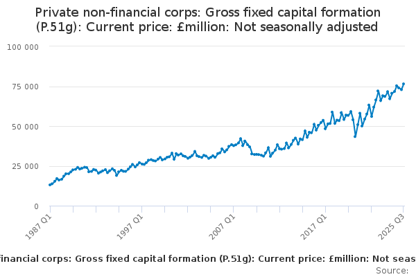 Download this time seriesPrivate non-financial corps: Gross fixed capital formation (P.51g): Current price: £million: Not seasonally adjusted