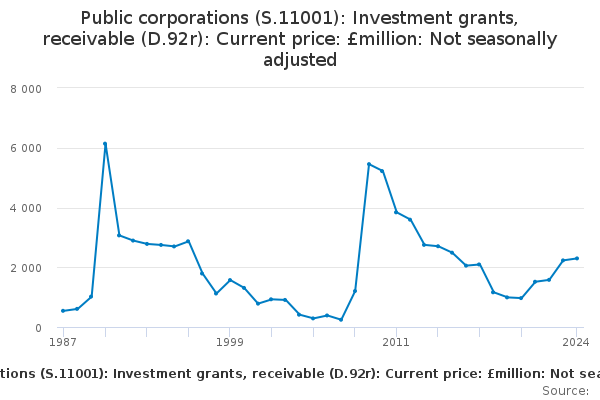 Download this time seriesPublic corporations (S.11001): Investment grants, receivable (D.92r): Current price: £million: Not seasonally adjusted