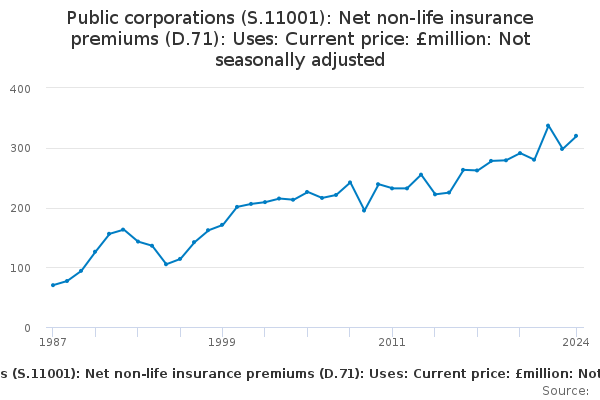 Download this time seriesPublic corporations (S.11001): Net non-life insurance premiums (D.71): Uses: Current price: £million: Not seasonally adjusted