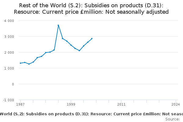 Download this time seriesRest of the World (S.2): Subsidies on products (D.31): Resource: Current price £million: Not seasonally adjusted