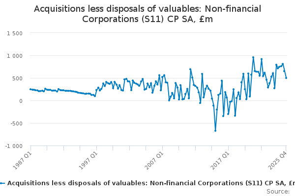 Download this time seriesAcquisitions less disposals of valuables: Non-financial Corporations (S11) CP SA, £m