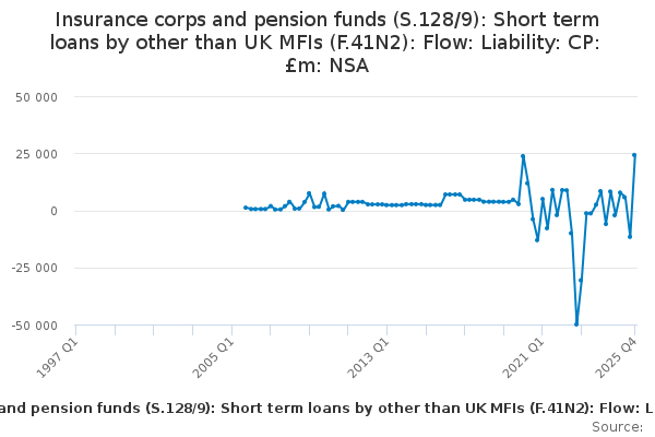 Download this time seriesInsurance corps and pension funds (S.128/9): Short term loans by other than UK MFIs (F.41N2): Flow: Liability: CP: £m: NSA