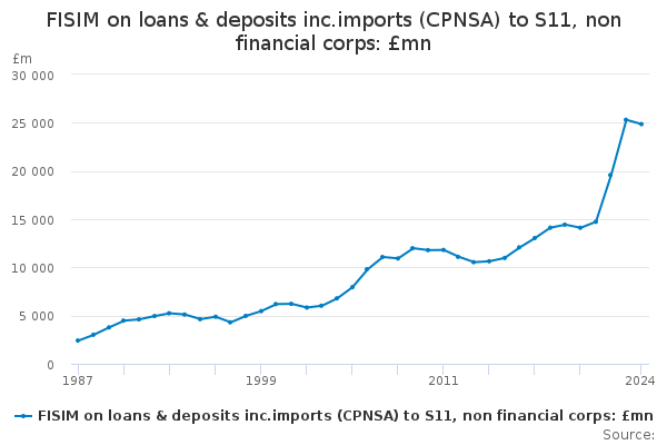 Download this time seriesFISIM on loans & deposits inc.imports (CPNSA) to S11, non financial corps: £mn