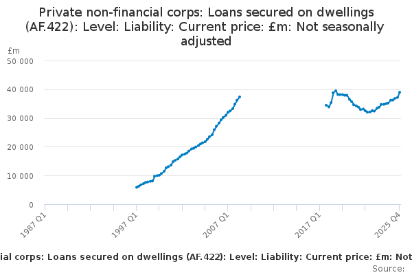 Download this time seriesPrivate non-financial corps: Loans secured on dwellings (AF.422): Level: Liability: Current price: £m: Not seasonally adjusted