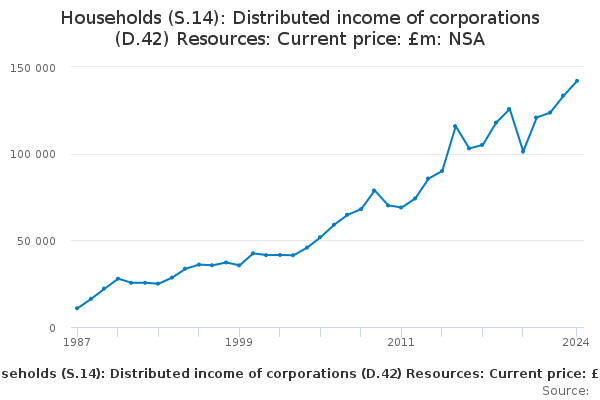 Download this time seriesHouseholds (S.14): Distributed income of corporations (D.42) Resources: Current price: £m: NSA