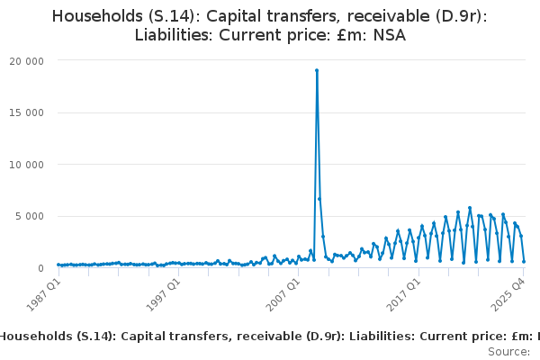 Download this time seriesHouseholds (S.14): Capital transfers, receivable (D.9r): Liabilities: Current price: £m: NSA