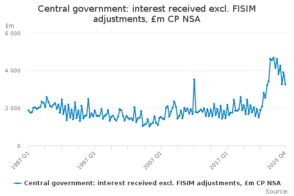 Download this time seriesCentral government: interest received excl. FISIM adjustments, £m CP NSA