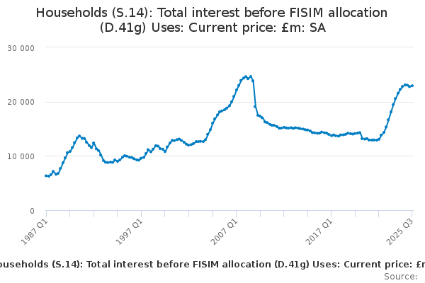 Download this time seriesHouseholds (S.14): Total interest before FISIM allocation (D.41g) Uses: Current price: £m: SA