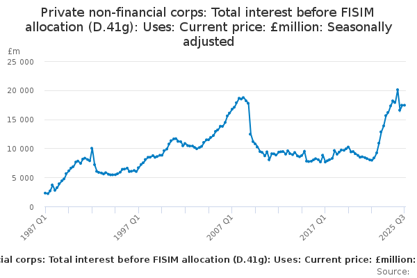 Download this time seriesPrivate non-financial corps: Total interest before FISIM allocation (D.41g): Uses: Current price: £million: Seasonally adjusted