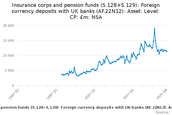 Download this time seriesInsurance corps and pension funds (S.128+S.129): Foreign currency deposits with UK banks (AF.22N12): Asset: Level: CP: £m: NSA