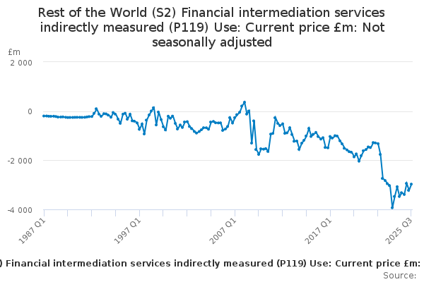 Download this time seriesRest of the World (S2) Financial intermediation services indirectly measured (P119) Use: Current price £m: Not seasonally adjusted