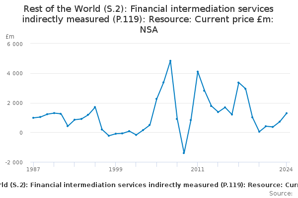 Download this time seriesRest of the World (S.2): Financial intermediation services indirectly measured (P.119): Resource: Current price £m: NSA