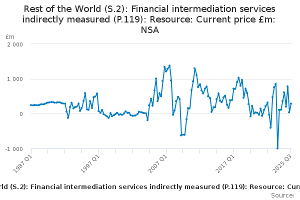 Download this time seriesRest of the World (S.2): Financial intermediation services indirectly measured (P.119): Resource: Current price £m: NSA