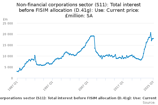 Download this time seriesNon-financial corporations sector (S11): Total interest before FISIM allocation (D.41g): Use: Current price: £million: SA
