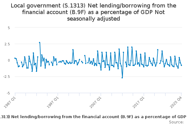 Download this time seriesLocal government (S.1313) Net lending/borrowing from the financial account (B.9F) as a percentage of GDP Not seasonally adjusted