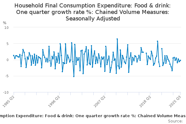 Download this time seriesHousehold Final Consumption Expenditure: Food & drink: One quarter growth rate %: Chained Volume Measures: Seasonally Adjusted