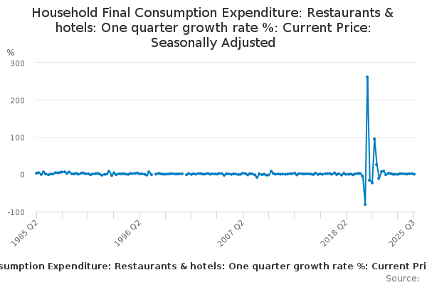 Download this time seriesHousehold Final Consumption Expenditure: Restaurants & hotels: One quarter growth rate %: Current Price: Seasonally Adjusted