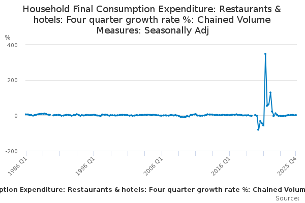 Download this time seriesHousehold Final Consumption Expenditure: Restaurants & hotels: Four quarter growth rate %: Chained Volume Measures: Seasonally Adj