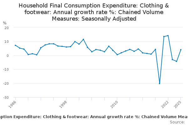 Download this time seriesHousehold Final Consumption Expenditure: Clothing & footwear: Annual growth rate %: Chained Volume Measures: Seasonally Adjusted