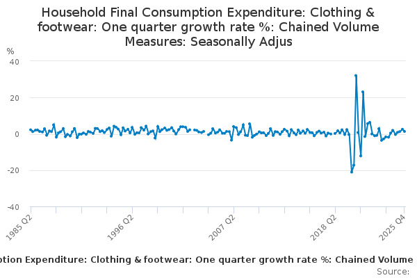 Download this time seriesHousehold Final Consumption Expenditure: Clothing & footwear: One quarter growth rate %: Chained Volume Measures: Seasonally Adjus