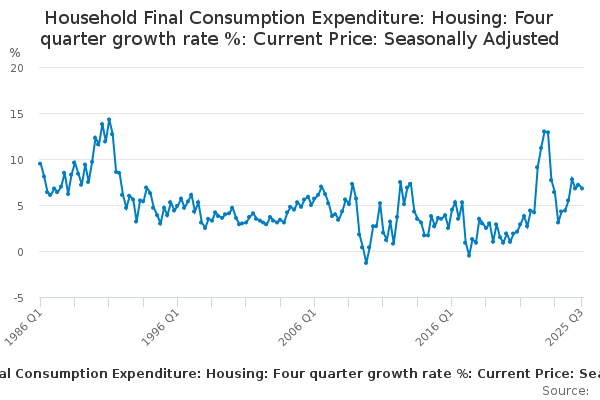 Download this time seriesHousehold Final Consumption Expenditure: Housing: Four quarter growth rate %: Current Price: Seasonally Adjusted