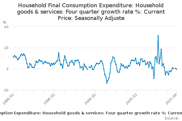 Download this time seriesHousehold Final Consumption Expenditure: Household goods & services: Four quarter growth rate %: Current Price: Seasonally Adjuste