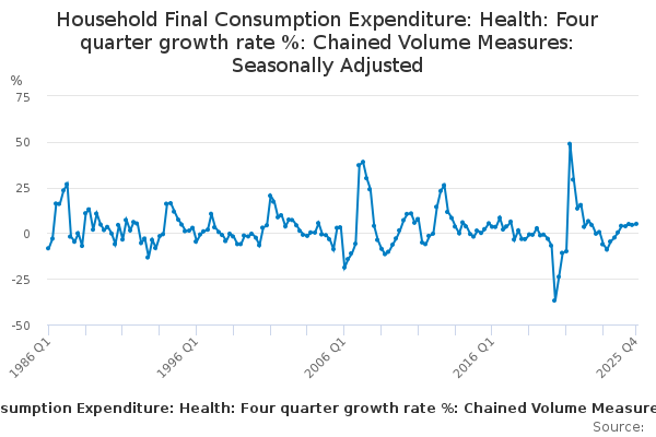 Download this time seriesHousehold Final Consumption Expenditure: Health: Four quarter growth rate %: Chained Volume Measures: Seasonally Adjusted