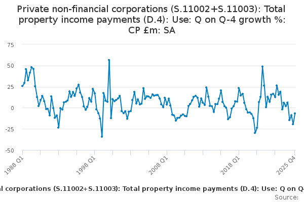 Download this time seriesPrivate non-financial corporations (S.11002+S.11003): Total property income payments (D.4): Use: Q on Q-4 growth %: CP £m: SA
