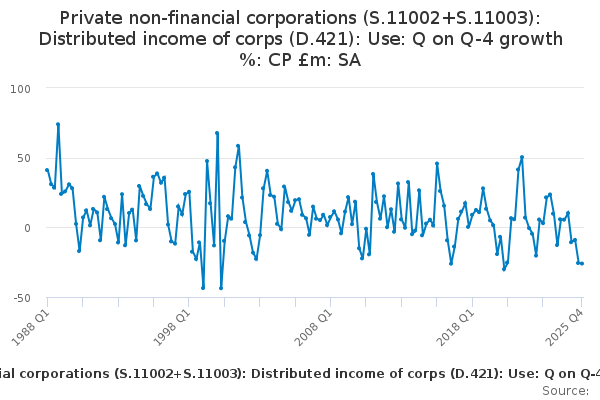 Download this time seriesPrivate non-financial corporations (S.11002+S.11003): Distributed income of corps (D.421): Use: Q on Q-4 growth %: CP £m: SA