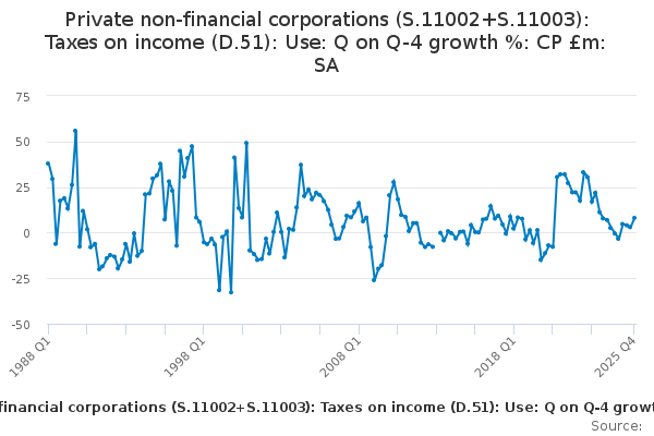 Download this time seriesPrivate non-financial corporations (S.11002+S.11003): Taxes on income (D.51): Use: Q on Q-4 growth %: CP £m: SA