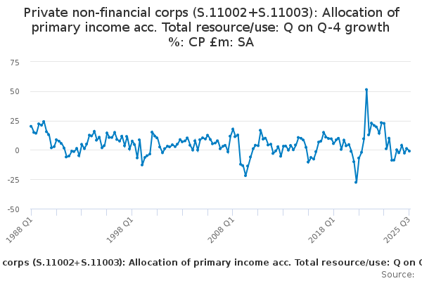 Download this time seriesPrivate non-financial corps (S.11002+S.11003): Allocation of primary income acc. Total resource/use: Q on Q-4 growth %: CP £m: SA