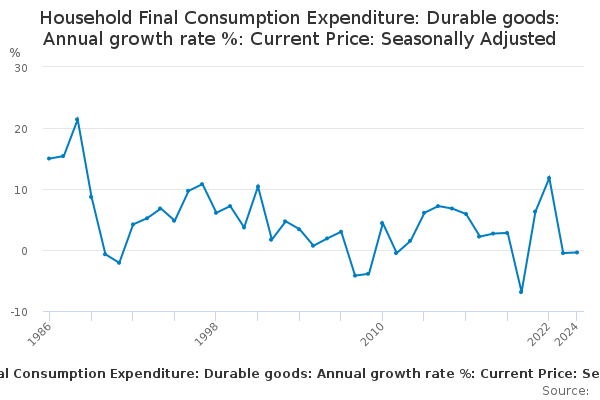 Download this time seriesHousehold Final Consumption Expenditure: Durable goods: Annual growth rate %: Current Price: Seasonally Adjusted