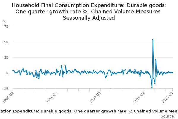 Download this time seriesHousehold Final Consumption Expenditure: Durable goods: One quarter growth rate %: Chained Volume Measures: Seasonally Adjusted