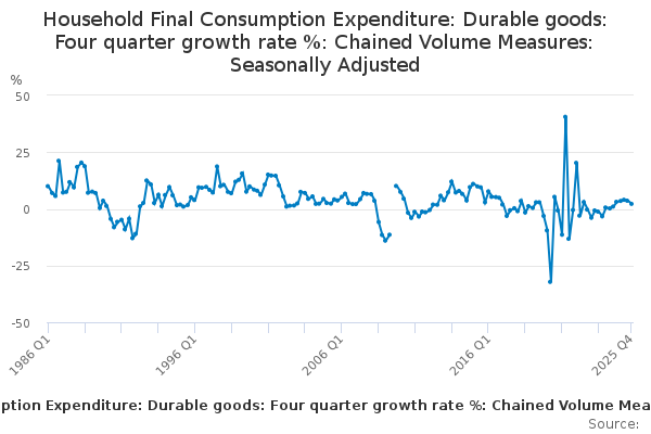 Download this time seriesHousehold Final Consumption Expenditure: Durable goods: Four quarter growth rate %: Chained Volume Measures: Seasonally Adjusted