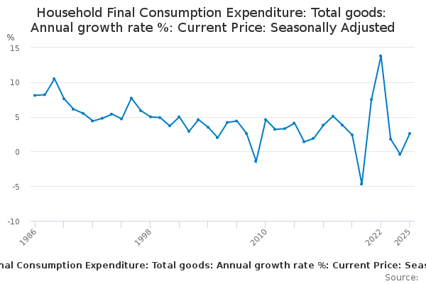 Download this time seriesHousehold Final Consumption Expenditure: Total goods: Annual growth rate %: Current Price: Seasonally Adjusted